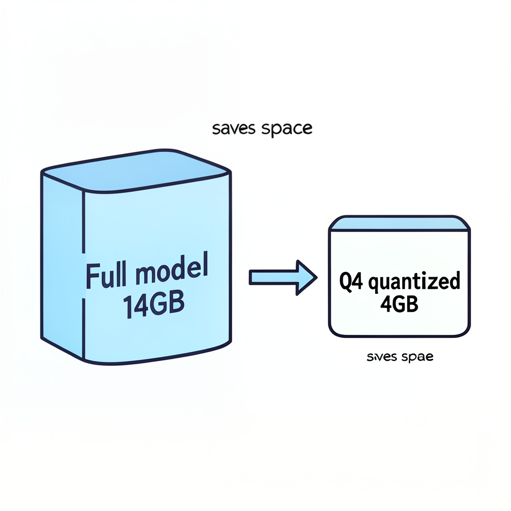 同一个模型(比如同一个 7B)往往会有好几个版本:有「完整版」(占空间大、要的显存多),也有「精简版」(把模型压缩后,占的空间和显存都小,效果略差一点,但很多人用着够)。这种压缩过的版本一般叫量化,名字里常带 Q4、Q8 等。